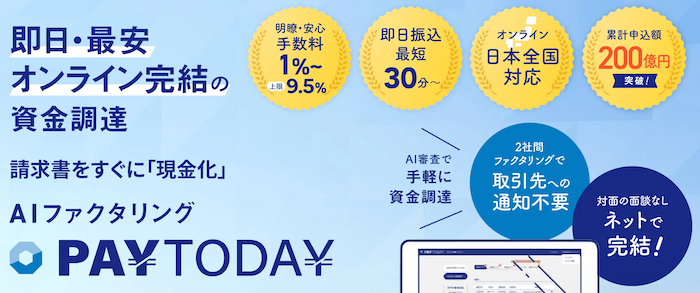 PAYTODAY(ペイトゥデイ)は、AIによる審査を導入し、最短30分という驚異的な入金スピードを実現したオンラインファクタリングです。