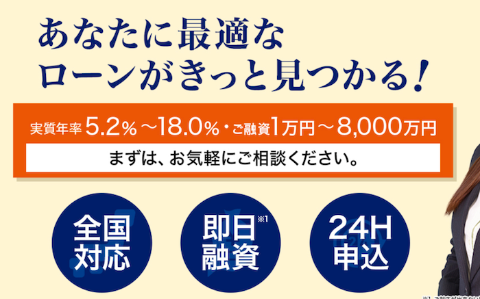 いつも4.8%~18.0%1万円~500万円最短即日審査最短45分。全国対応で個人事業主もOK、柔軟な審査が魅力。