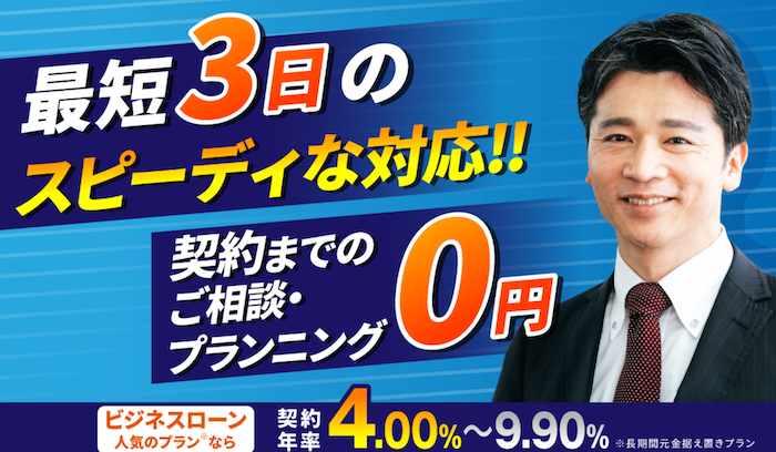 特に、時間をかけずに無担保で資金を確保したい中小企業や個人事業主に向いているビジネスローンです。