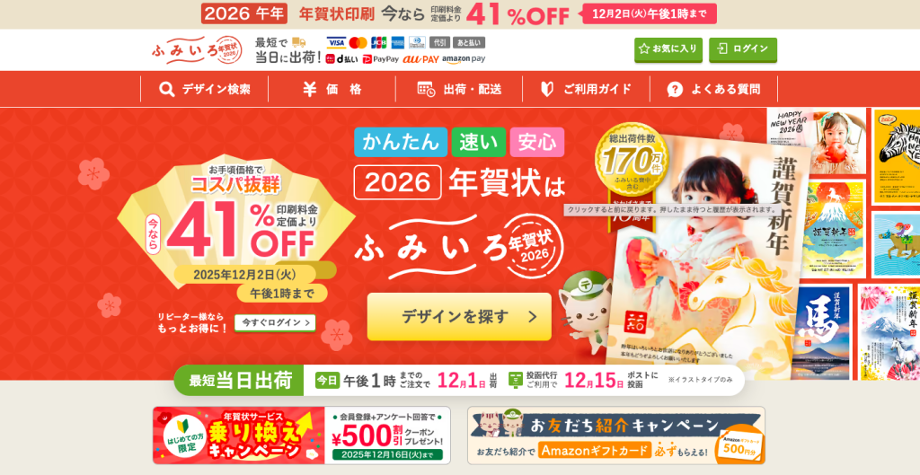 ふみいろは「かんたん・速い・安心」の3つが揃った年賀状印刷サービスです。10年以上の運営実績があり、総出荷件数は170万件以上と利用者も多いため初めてでも安心して利用できます。