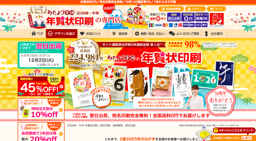 おたより本舗はネット通販受注件数5年連続全国第1位・顧客満足度98%という実績を持つ人気の高い年賀状印刷サービスです。