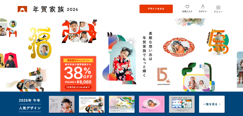 年賀家族はサービス開始から15周年を迎える実績ある年賀状印刷サービスです。専属クリエイターが在籍しており、レイアウトやフォントのバリエーションが豊富なためデザインにこだわりたい方に特におすすめです。