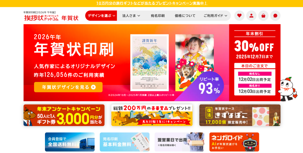 挨拶状ドットコムは年賀状をはじめ、喪中はがき・寒中見舞いはがきといった季節のご挨拶はもちろん、引越し報告や結婚報告、ビジネスシーンで活用する各種挨拶状まで幅広い用途に対応する挨拶状専門サービスです。
