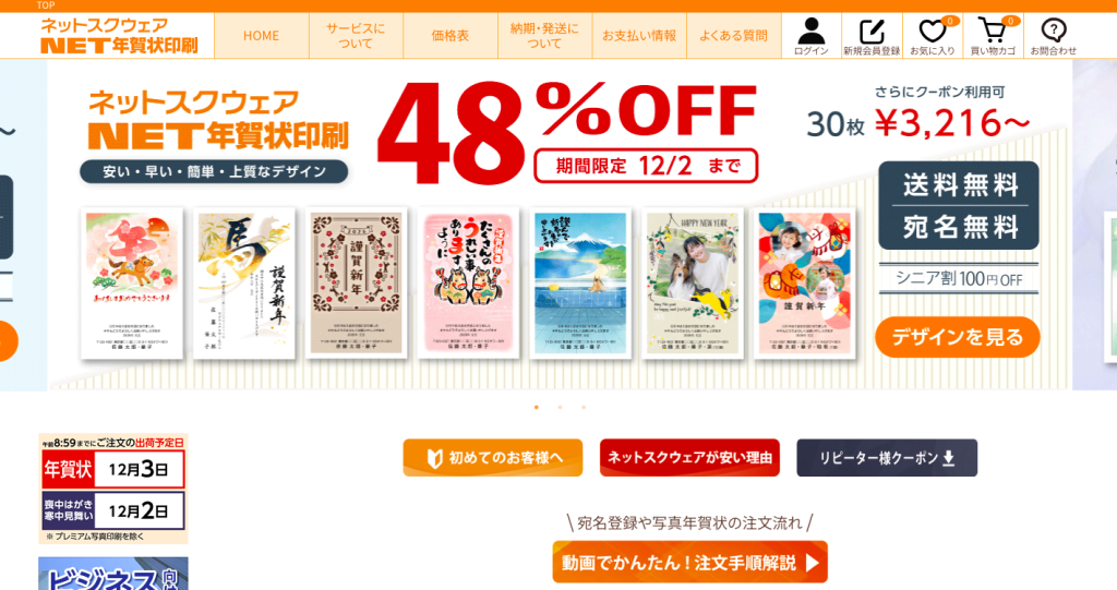 「年末は忙しくて自宅で投函する時間がない」「遠方の人に直接届けたい」という場合に便利です。サービスによっては指定日までに郵便局へ届けてくれるところもありますが、多くは「印刷完了後、順次投函」という形になります。