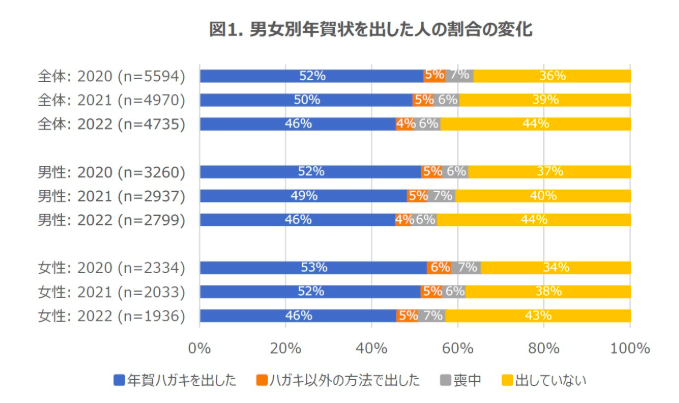 出典元:どんな人が年賀状を出しているのか?-男女、年齢層、地域別、年賀状を出した人の割合 (2020~2022)
