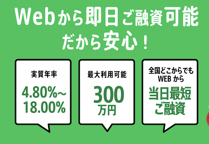 WEB申込にも対応しており、全国どこからでも申し込みできます。平日14時までの申し込みであれば、当日中の振込融資にも対応しています。