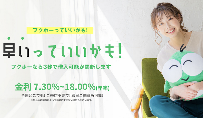 大阪市浪速区に本社を構える「フクホー」は、創業から50年以上の実績を持つ中堅消費者金融です。金利水準は大手とほぼ同じで、全国どこからでもWEB申し込みが可能。来店不要で、条件を満たせば即日融資にも対応しています。