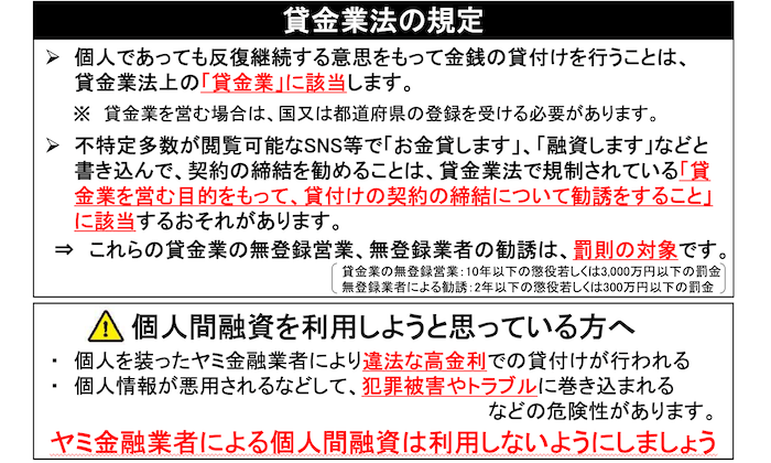 さらに、金融庁では個人間の貸し借りであっても貸金業法に抵触すると注意喚起しています。