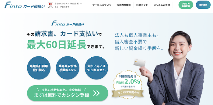 | Fintoカード後払い | 2.5% *2026年3月までは2.0% | 即日翌日 | Visa、Mastercard、JCB セゾン | AIで請求書をデータ化し、カード後払いで最大60日支払猶予 | 公式 |