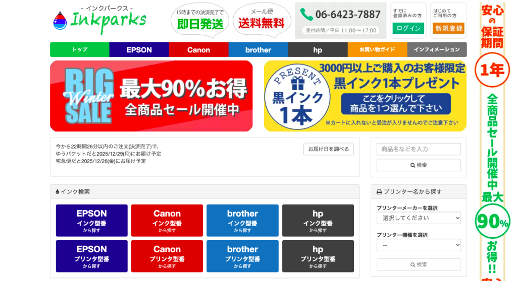 「安いけど品質は大丈夫?」と思う方も安心できるよう、1年間の保証付き。加えて15時までの注文は当日発送、3,000円以上の購入で黒インク1本プレゼントなど、サービス面も充実しています。