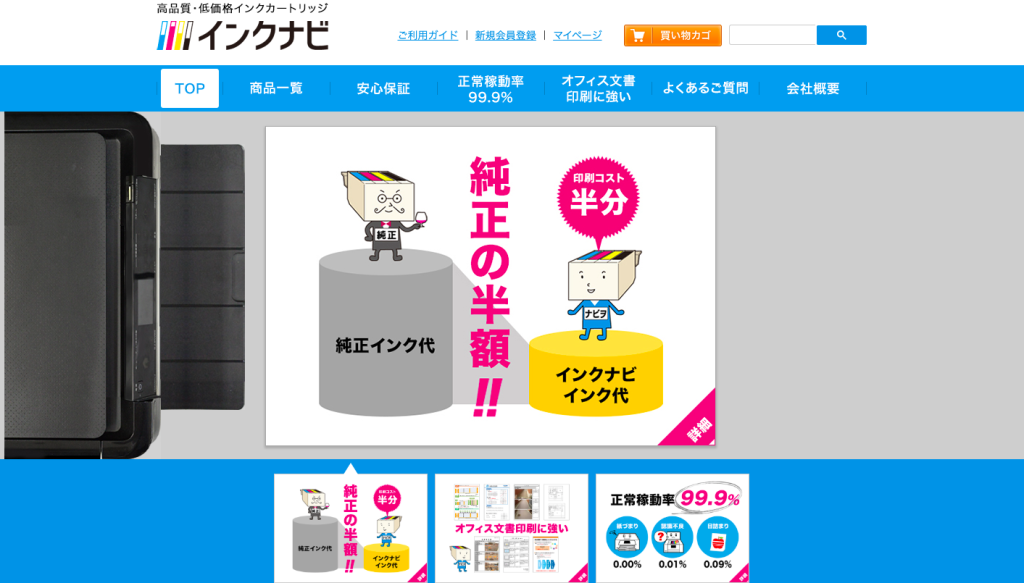 インクナビは「純正の半額」を掲げるコスパ重視の互換インクサービスです。