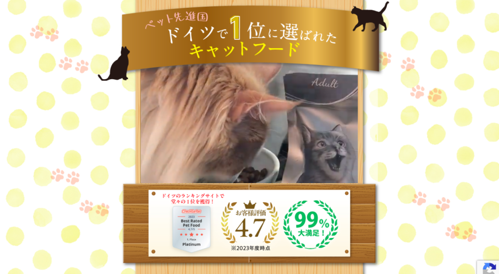 プラチナムキャットフードはドイツで「おいしさNo.1」に選ばれた実績を持つ高品質キャットフードです。2023年にはペット先進国として知られるドイツのランキングサイトにて第1位(※1)を獲得しました。