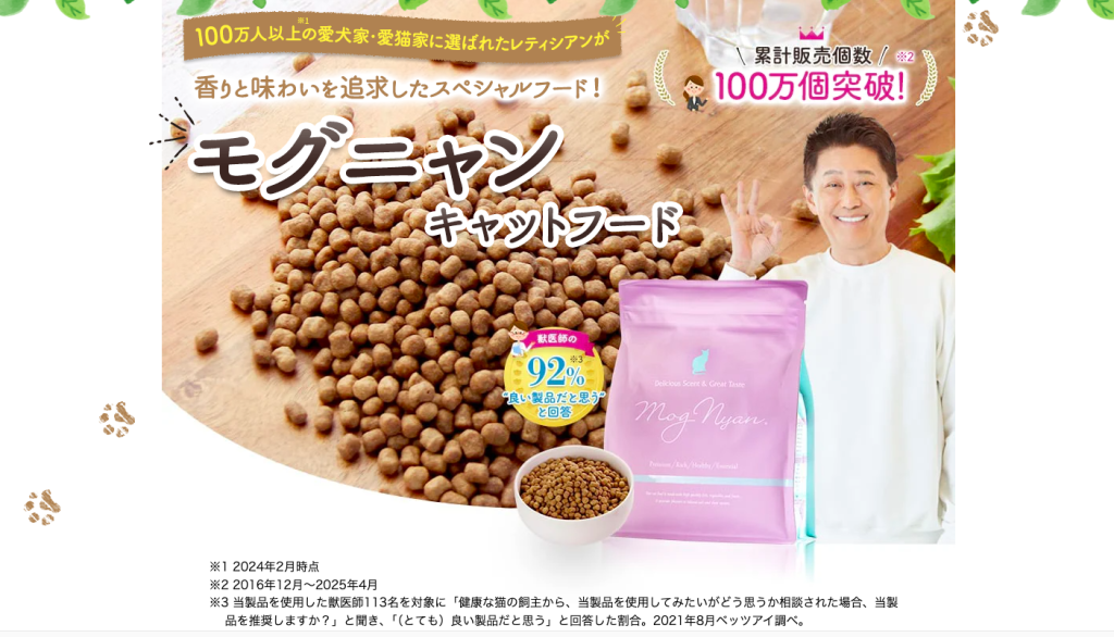 モグニャンキャットフードは累計販売個数100万個を突破している人気のキャットフードで獣医師の92%が「良い製品だと思う」と回答(※1)している点も信頼できるポイントです。