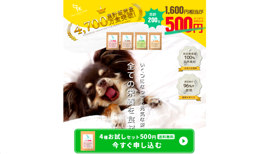 ドッグフード工房は累計販売量4,700万食を突破し、獣医師の96%(※1)が推奨しているオールナチュラルドッグフードです。