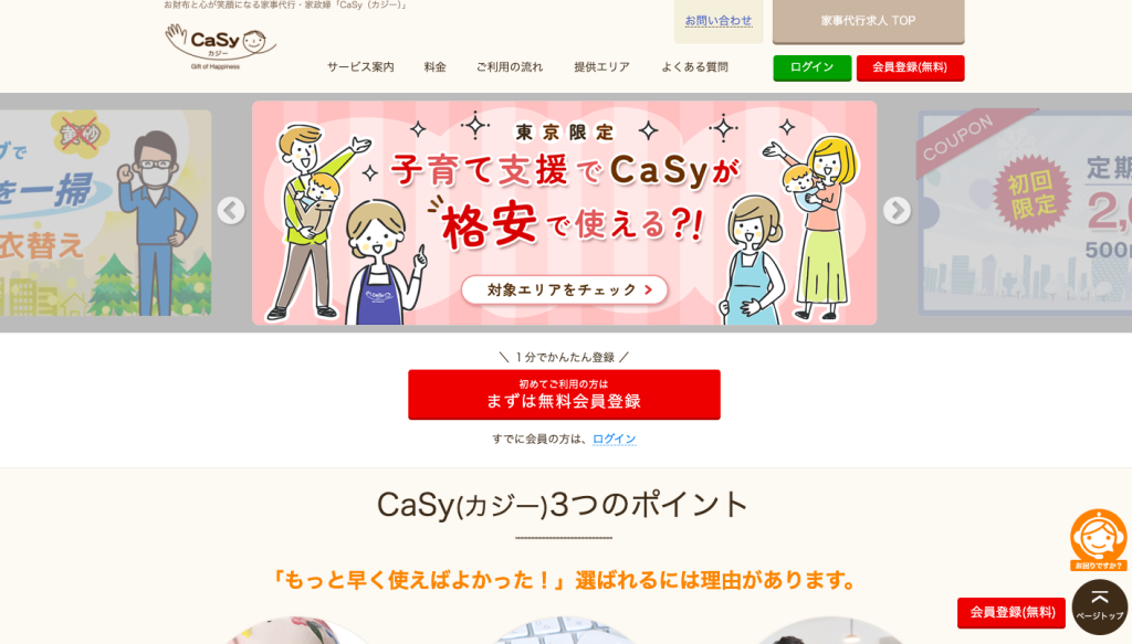 CaSy(カジー)はスマホやPCから手軽に予約できる家事代行サービスで、掃除・料理・整理整頓といった日常的な家事を研修を受けたプロのスタッフが代行してくれます。