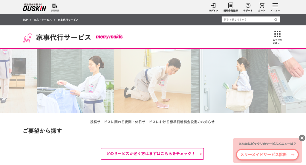 メリーメイドサービスは掃除のプロとして知られるダスキン(DUSKIN)が運営する家事代行サービスです。業界のパイオニア的存在で、年間97万件以上のサービス実績を誇り長年にわたって定期利用している家庭も多く、暮らしに欠かせない存在として支持されています。