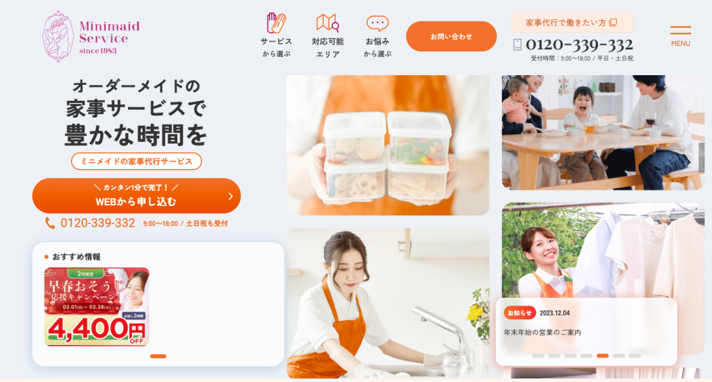 ミニメイド・サービスは、1983年に創業した日本で初めての家事代行サービスと言われる、業界きっての老舗ブランドです。厳しい自社試験に合格したプロが担当。継続率が96%と非常に高く、長く付き合える安心感があります。