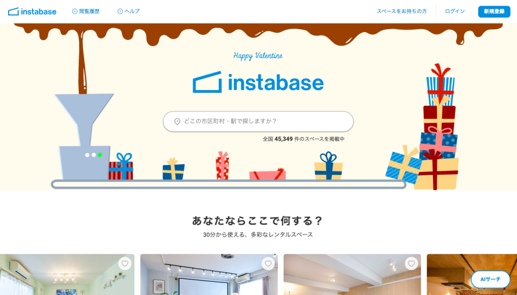 全国4万件以上の登録数を誇る国内最大級のレンタルスペース予約プラットフォーム「インスタベース」は、会議室やセミナー会場といったビジネス利用からキッチン付きルームやダンススタジオ、展示会場などの多種多様なニーズまでを網羅する汎用性の高いサービスです。