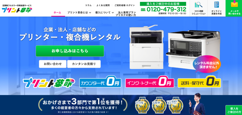プリント革命もスリホと同様の定額制レンタルプリンターサービスで、14年の運営実績を持ちます。さらに「注目度」「支持率」「コスト削減が期待できる」の3部門で1位を獲得している実績があり、多くの企業から高く評価されています。