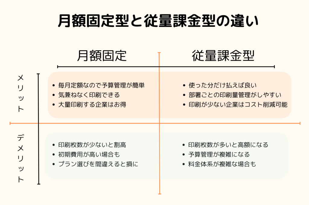 また大量印刷を行う企業なら従量課金制と固定制のどちらが得かも判断ポイントになります。