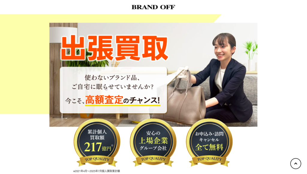 ブランドオフは経験豊富な査定スタッフが自宅まで訪問し、大きな品物や重い荷物、点数が多い場合でもその場でスムーズに査定・買取してくれる出張サービスです。累計買取額は217億円以上、さらに上場企業グループが運営していることから実績と信頼性の高さも魅力です。
